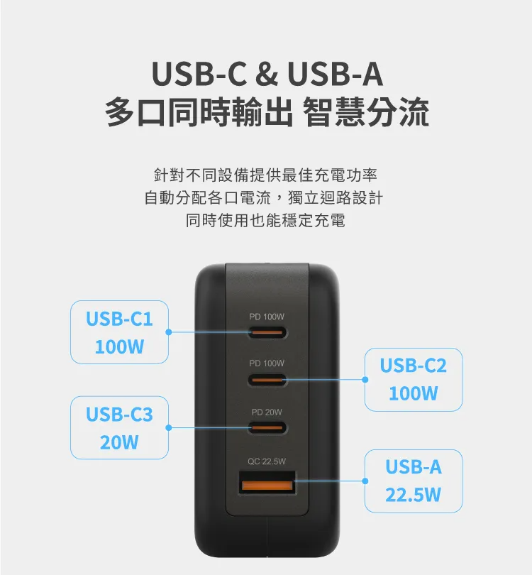 • 多口同時輸出可以智能調節輸出功率,針對不同設備提供最佳充電功率