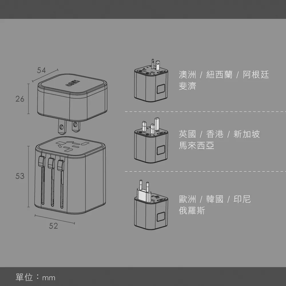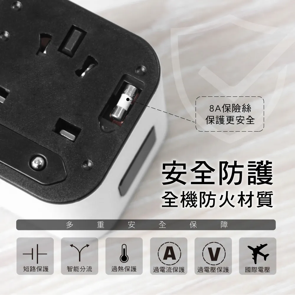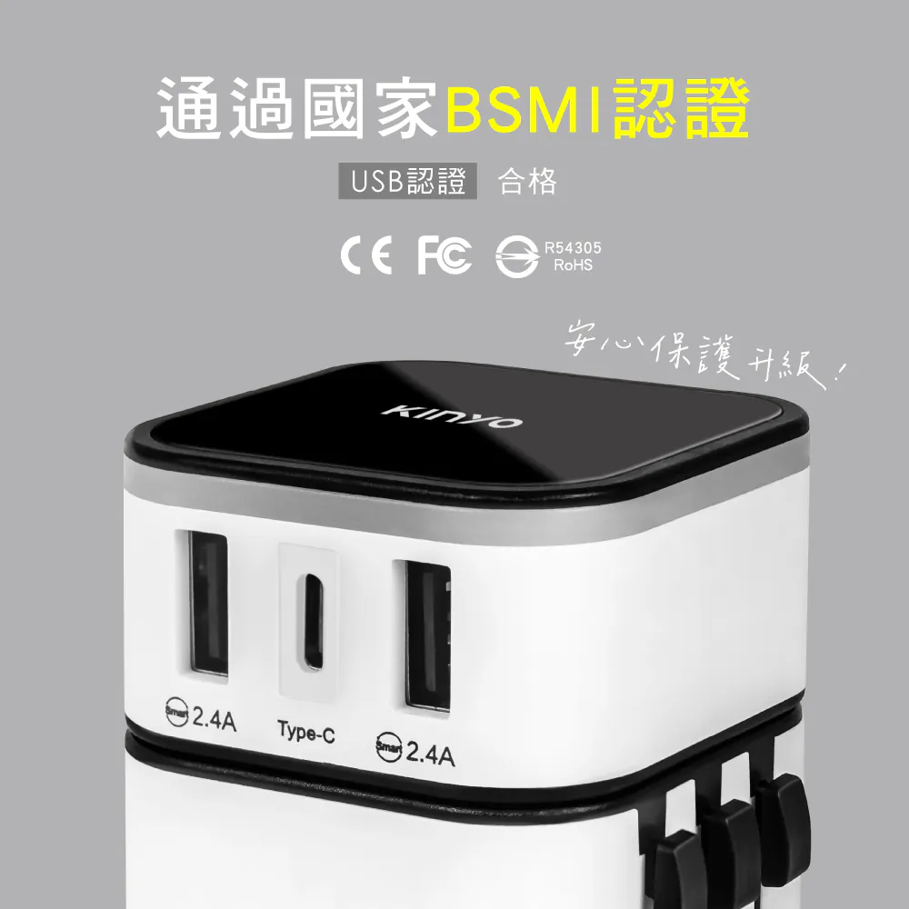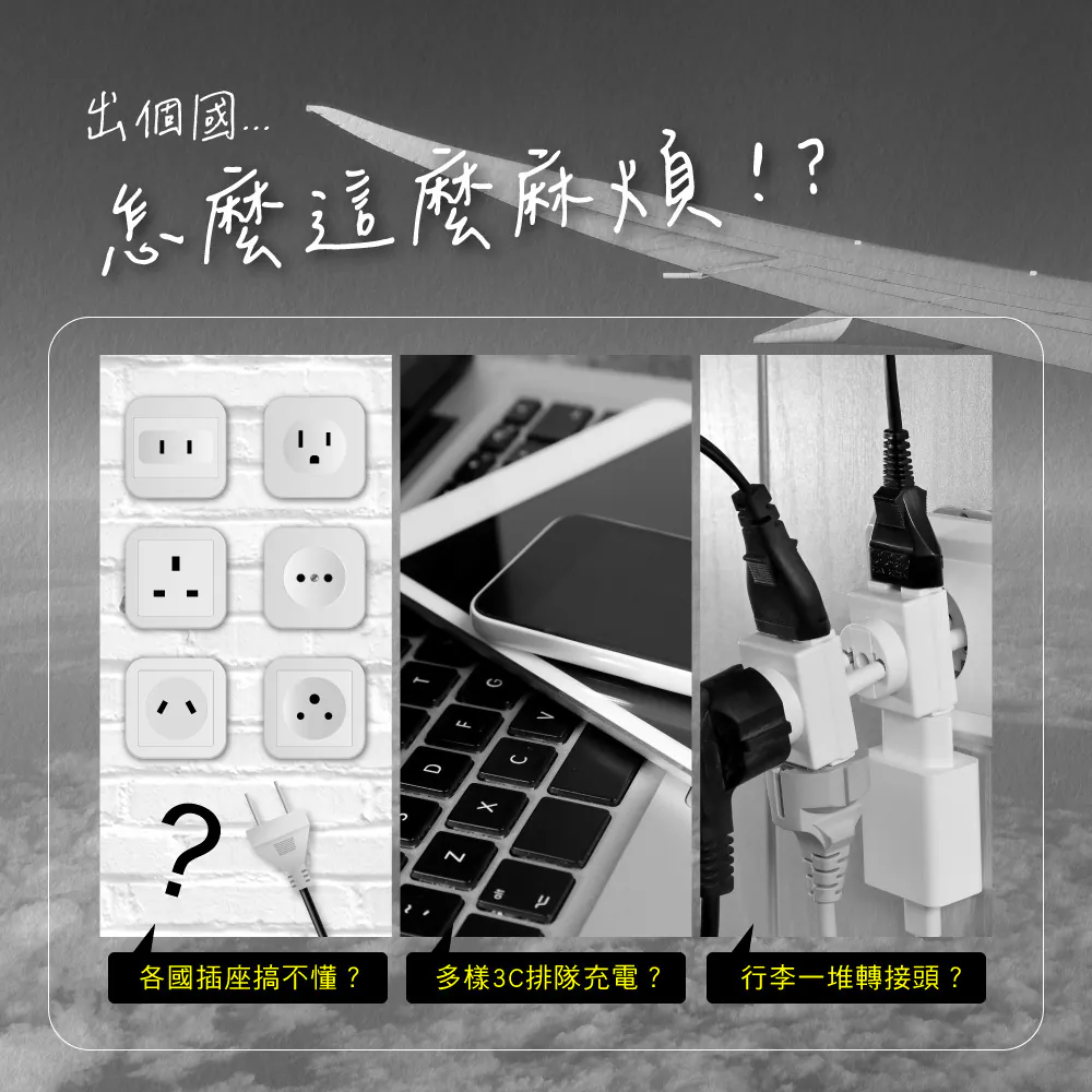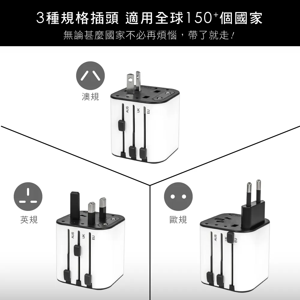 • 2孔USB+1孔Type-C,三種多國插頭,外出一顆就夠用。
