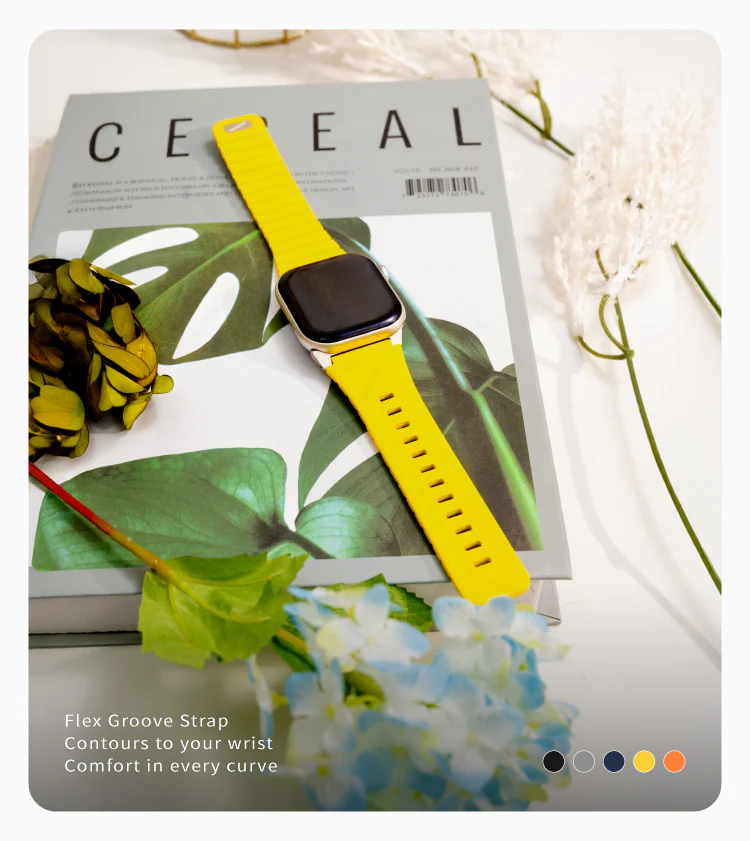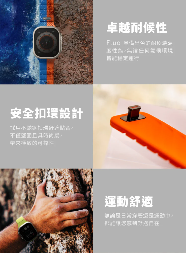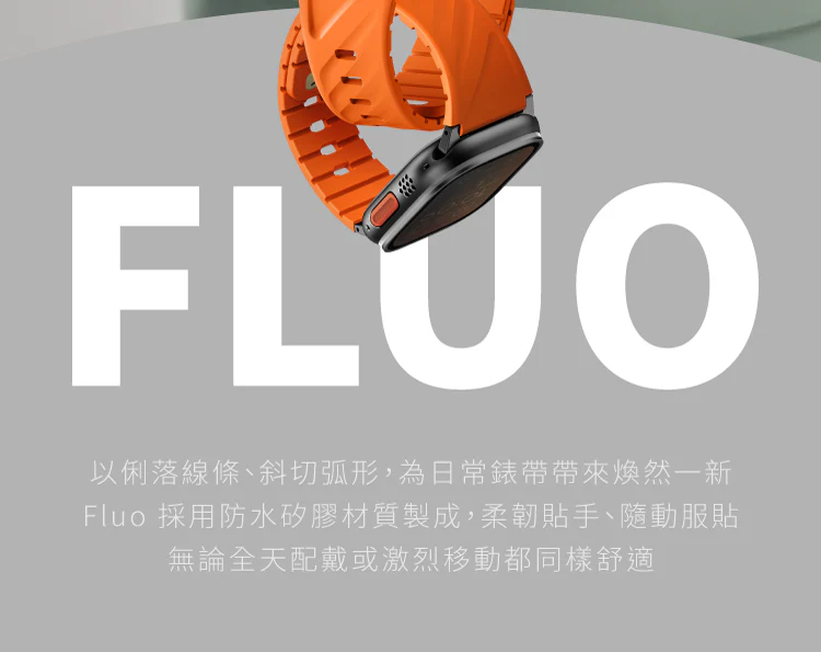 Fluo 採用防水矽膠材質,輕盈耐用。磁吸扣合搭配插扣設計,結合專屬訂製不鏽鋼錶扣,提供全天候的舒適佩戴與穩固貼合。
