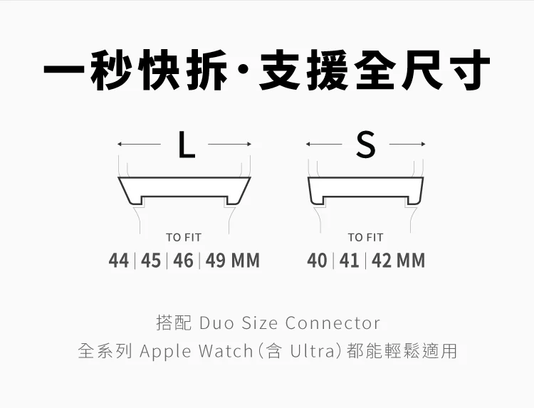 • 隨附兩個可調整連接器,相容 40mm 至 49mm 手錶