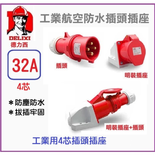 【現貨】德力西工業航空防水插座 插頭 32A 防水連接器 4芯 不帶線 四孔 四腳 防水型 充電樁 旅充 明裝
