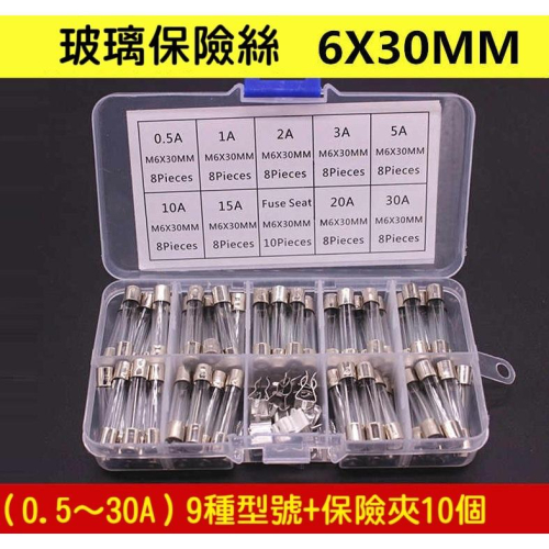 【現貨】6X30MM 玻璃保險絲 72個盒裝 0.5A~30A 10種 保險管 玻璃管