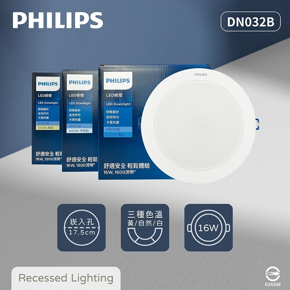 【純粹生活】飛利浦 PHILIPS LED DN032B 16W 白光 黃光 自然光 17.5cm 崁燈