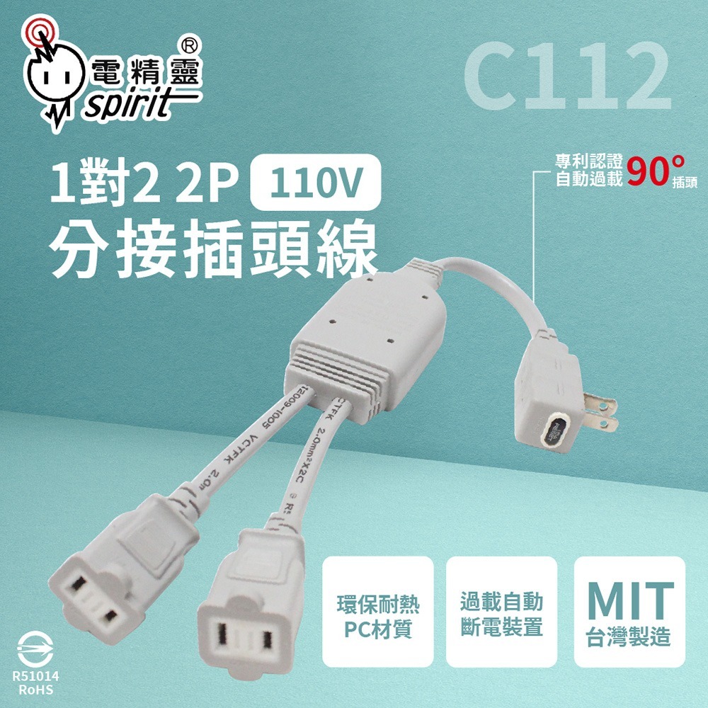 【電精靈spirit】C112 自動過載 110V 1對2 2P 分接線 分接插頭線 延長線
