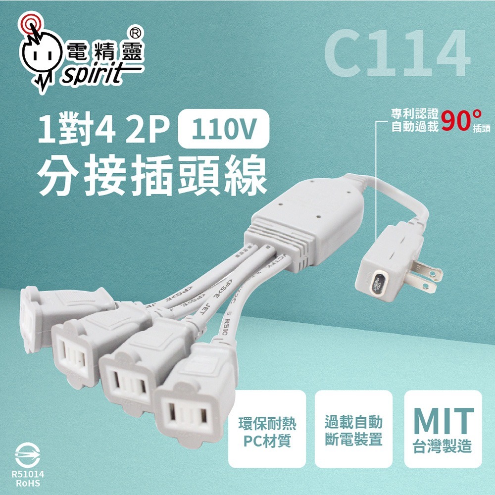 【電精靈spirit】C114 自動過載 110V 1對4 2P 分接線 分接插頭線 延長線