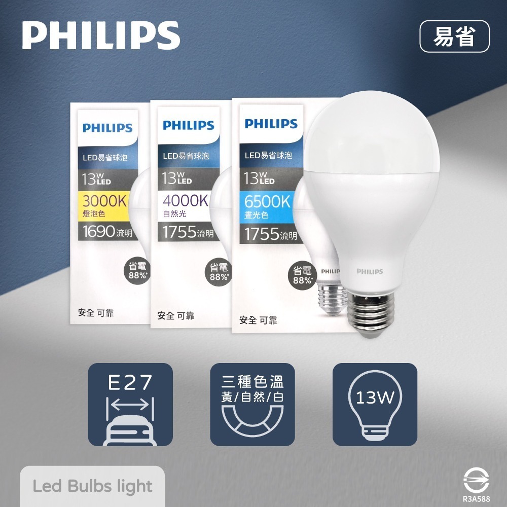 【飛利浦 PHILIPS】2024年最新款 LED 13W 白光 黃光 自然光 E27 易省 燈泡 球泡燈