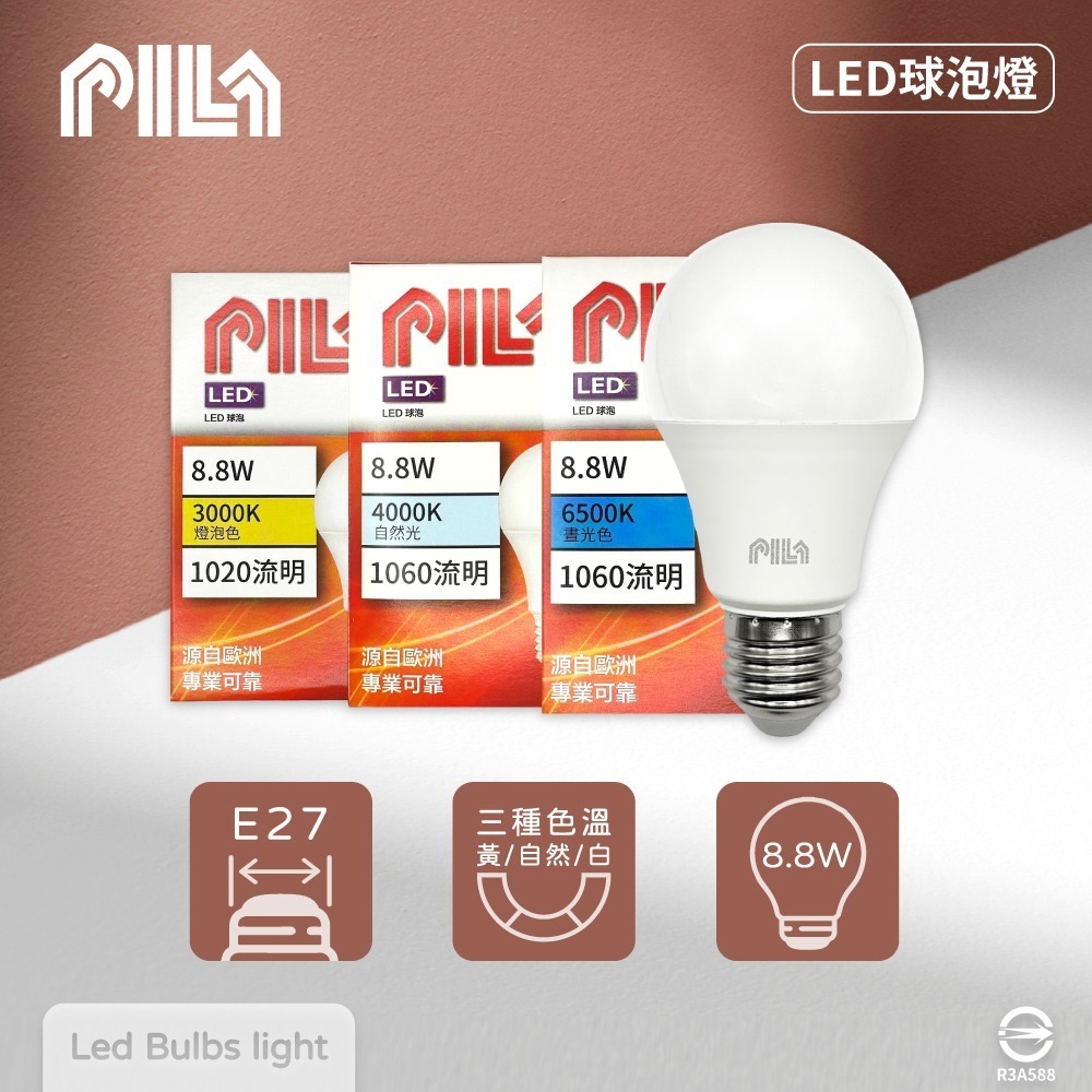 【純粹生活】 沛亮 PILA LED 8.8W 白光 黃光 自然光 全電壓 球泡燈 燈泡