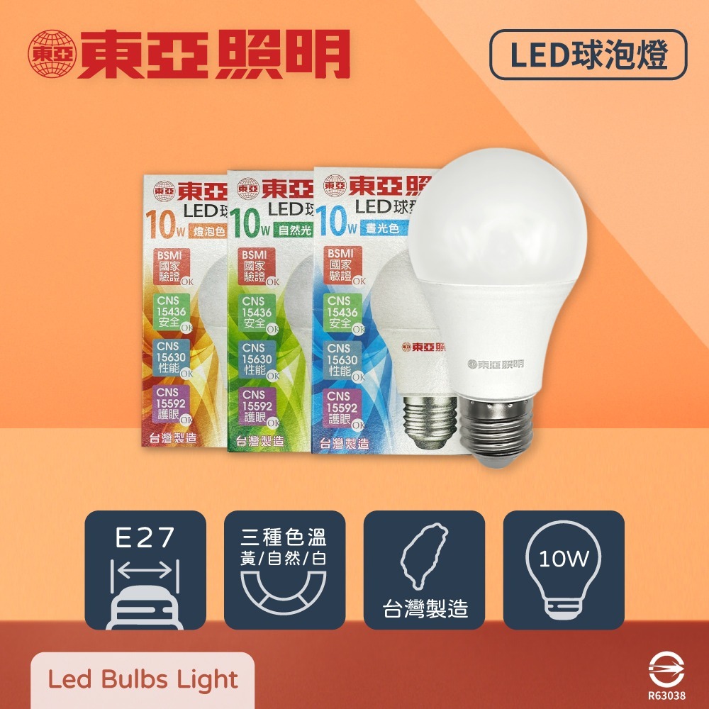 【東亞照明】台灣製造 LED燈泡 10W 全電壓 E27 球泡燈 (白光/自然光/黃光)