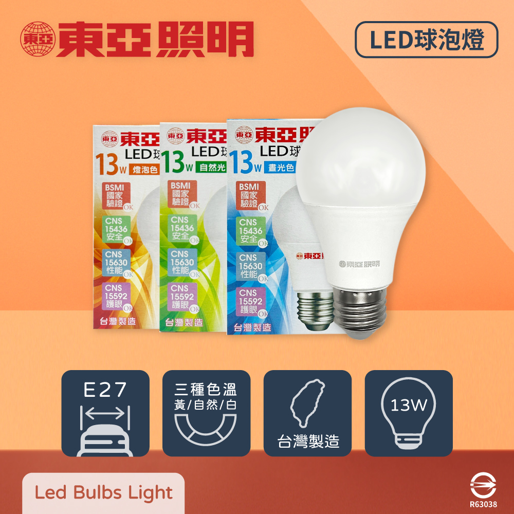 【東亞照明】台灣製造 LED燈泡 13W 全電壓 E27 球泡燈 (白光/自然光/黃光)