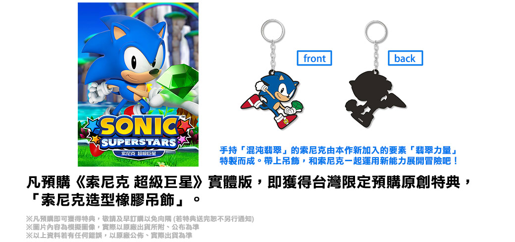 凡預購《索尼克 超級巨星》實體版,即獲得台灣限定預購原創特典,「索尼克造型橡膠吊飾」。手持「混沌翡翠」的索尼克是根據本作新加入的要素「翡翠力量」特製而成。帶上吊飾,和索尼克一起運用新能力展開冒險吧!