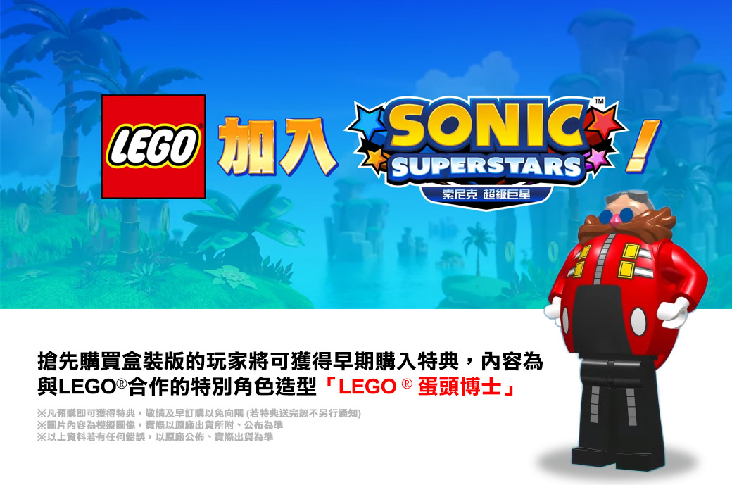 搶先購買盒裝版的玩家將可獲得早期購入特典,內容為與LEGO®合作的特別角色造型「LEGO ® 蛋頭博士」