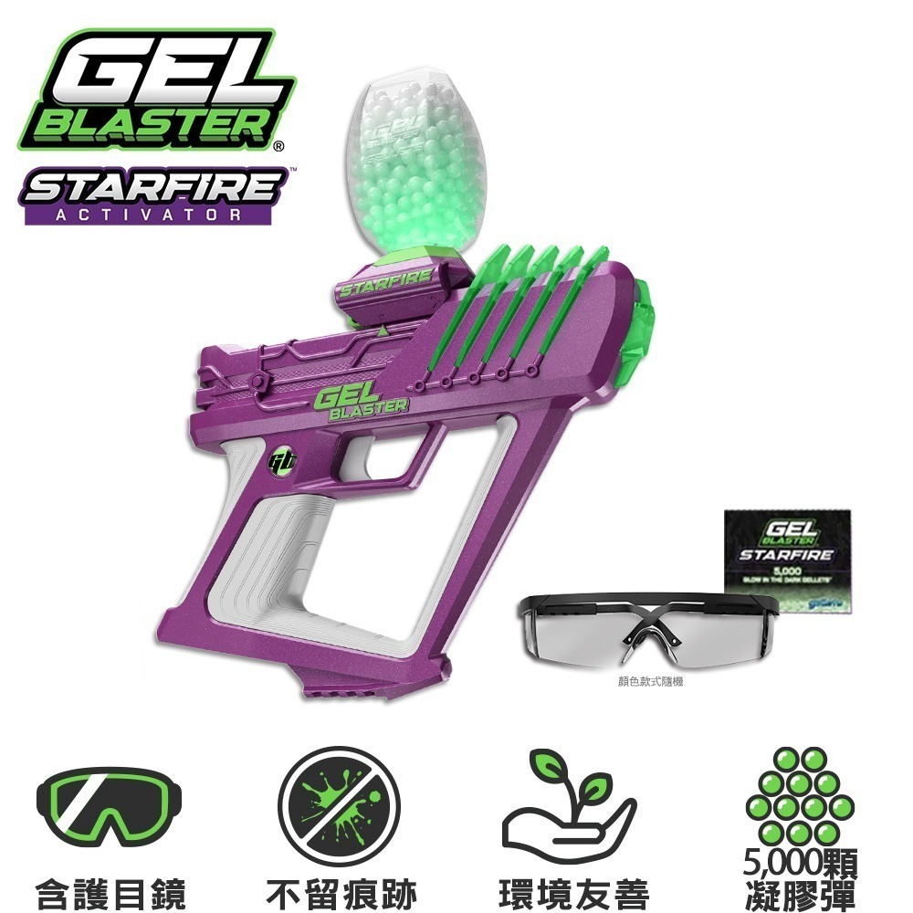 商品內含:Gel Blaster Surge StarFire(含彈匣/高速槍管) x1、5,000顆夜光凝膠彈 Gellets®、橙色低速管x1、夜光雷射座*x1、槍管拆卸工具x1、USB-C 充電線x1、安全護目鏡(款式顏色隨機)x1、使用說明書x1