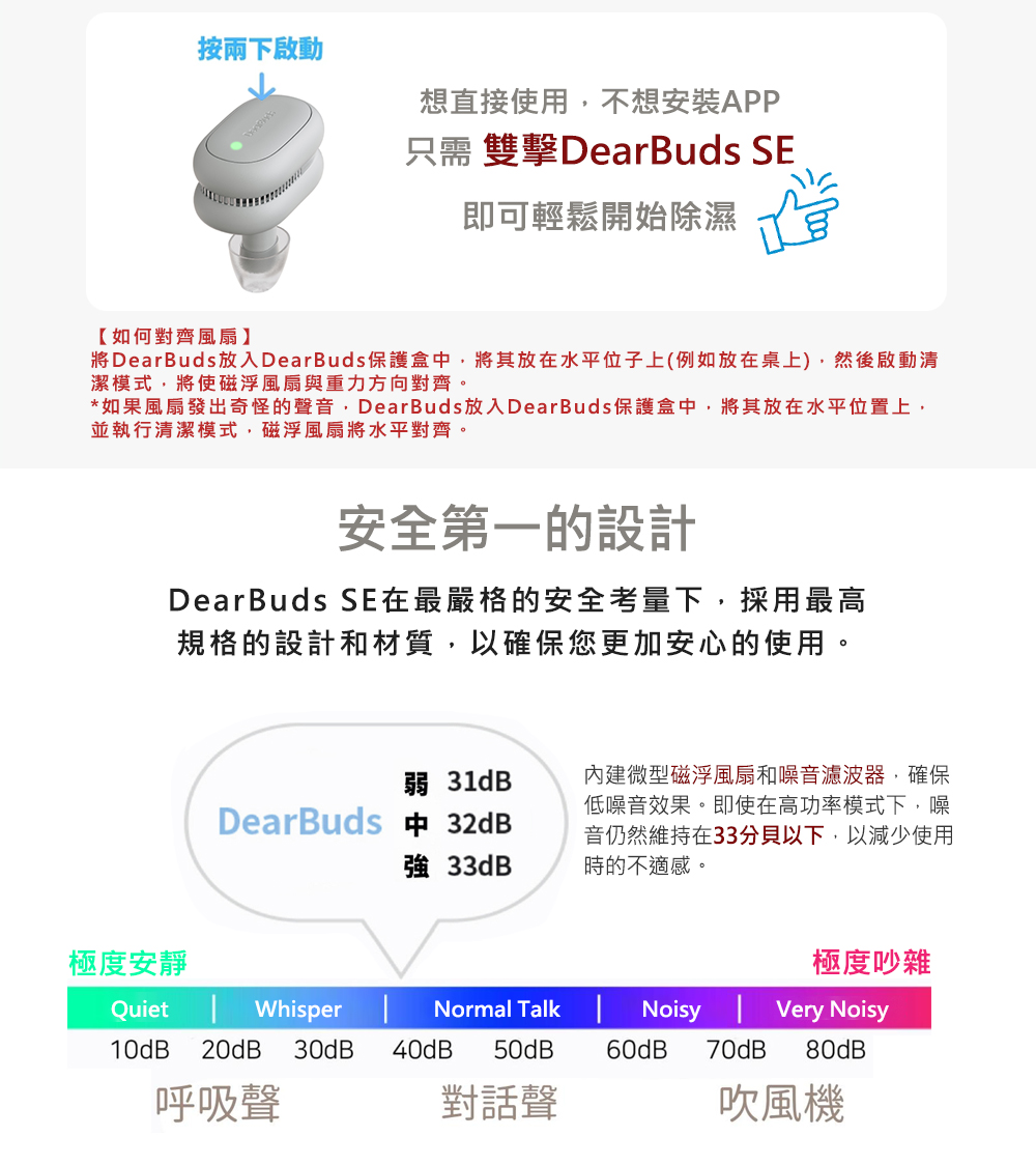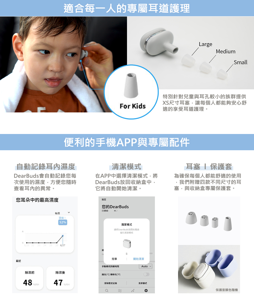 1.DearBuds耳內除濕器 不防水,欲清洗耳塞,請務必將其取下單獨清洗,切勿連同主機一起水洗,避免發生故障毀損,受潮進水屬於人為損壞,非保固範圍。