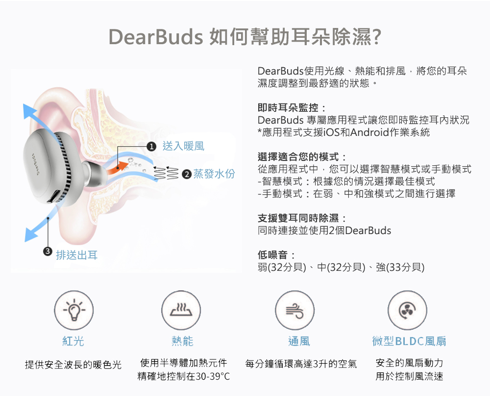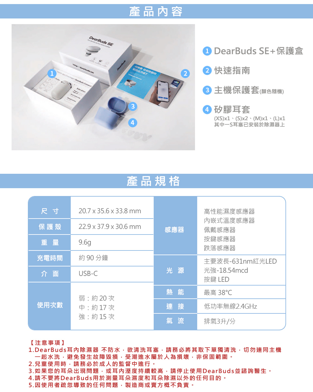 4.請不要將DearBuds用於測量耳朵濕度和耳朵除濕以外的任何目的。