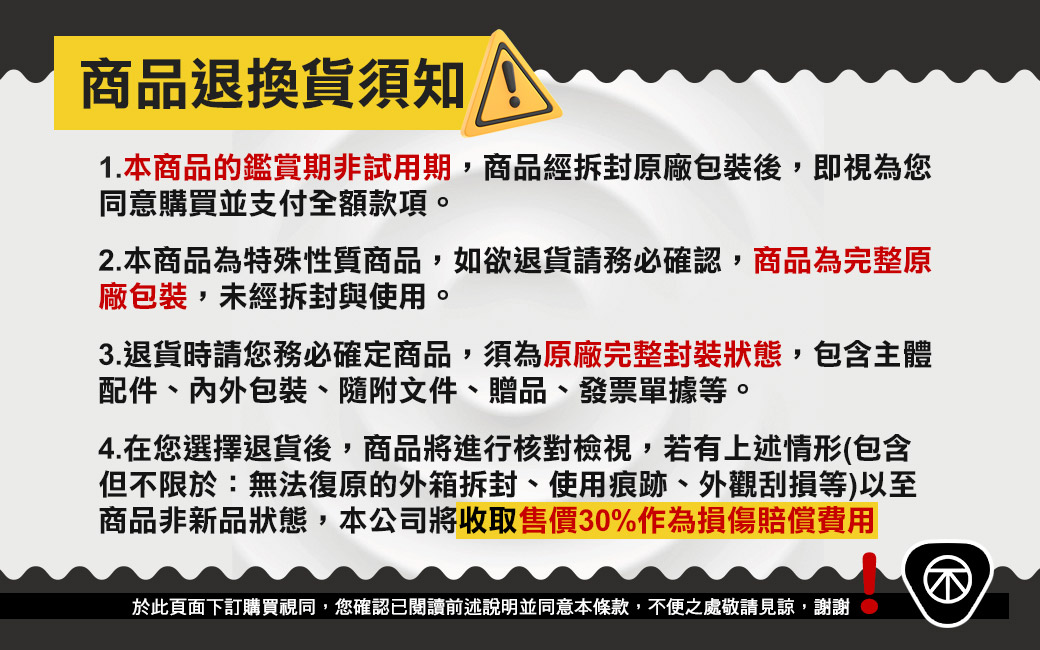 1.本商品的鑑賞期非試用期,商品經拆封原廠包裝後,即視為您同意購買並支付全額款項。