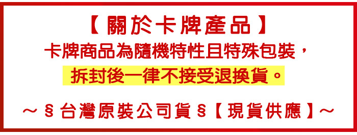 ※卡牌商品為隨機特性且特殊包裝,拆封後無法恢復至未拆封之原狀,故經拆封後一律不接受退換貨。