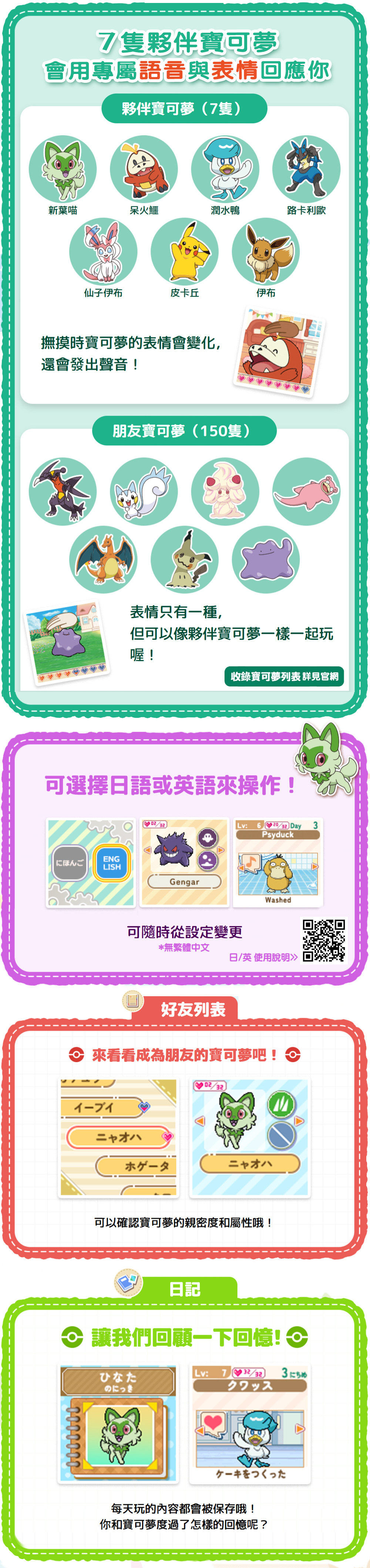 夥伴寶可夢內建表情演出與專屬語音,強化真實的陪伴感,玩家不只能飼養前述的基礎夥伴,還能與來自《寶可夢》世界 9 個地區、超過 150 隻寶可夢相遇,例如快龍、波加曼、耿鬼、百變怪等人氣角色。