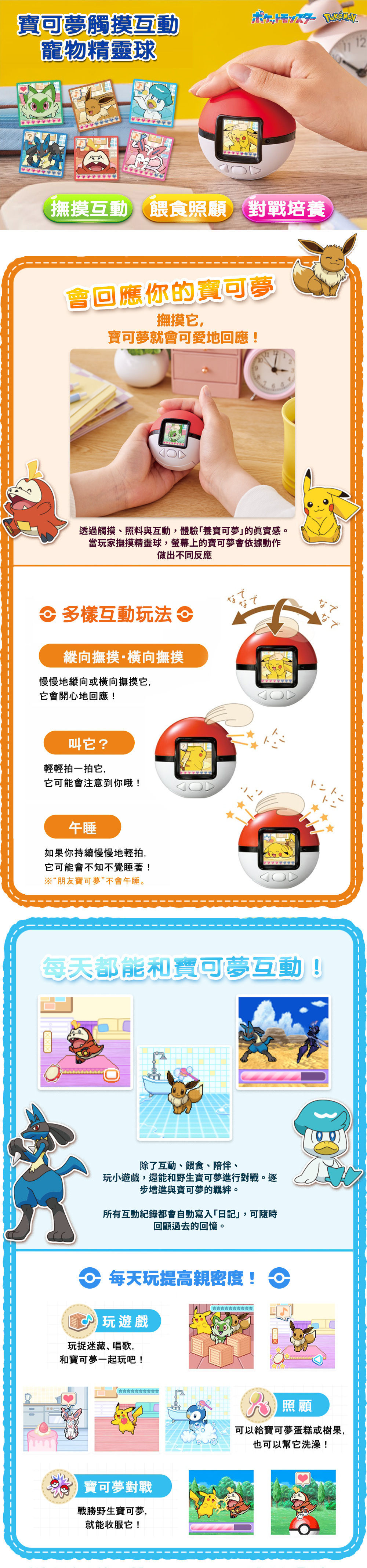 結合電子寵物養成與精靈球造型,玩家可透過觸摸、照料與互動,體驗「養寶可夢」的真實感。當玩家撫摸精靈球,螢幕上的寶可夢會依據動作做出不同反應: