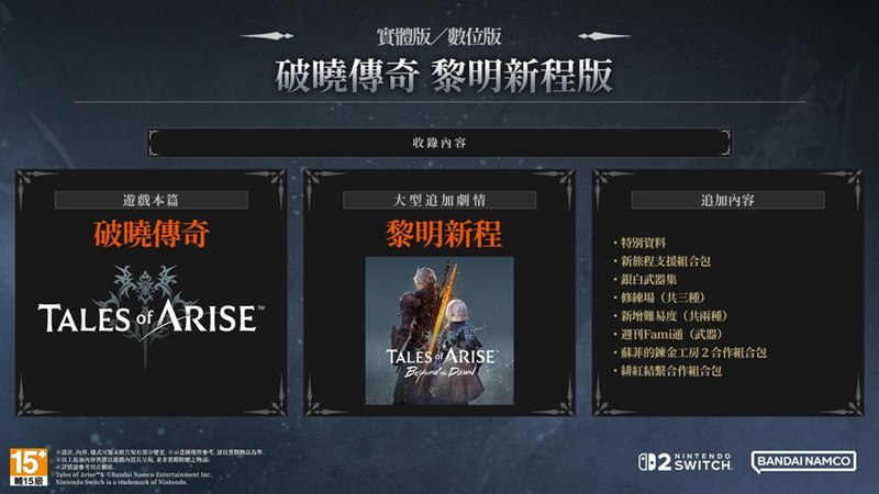 本商品收錄《破曉傳奇》遊戲本篇以及大型 DLC《破曉傳奇 黎明新程》,更收錄追加任務與可於遊戲內使用的服裝與道具等各式內容。