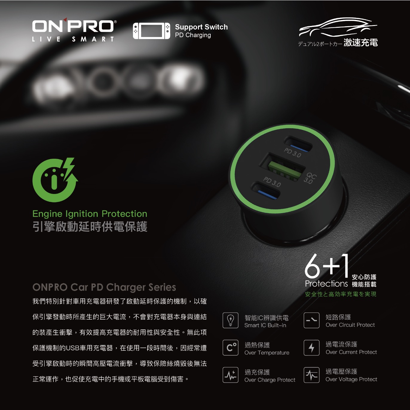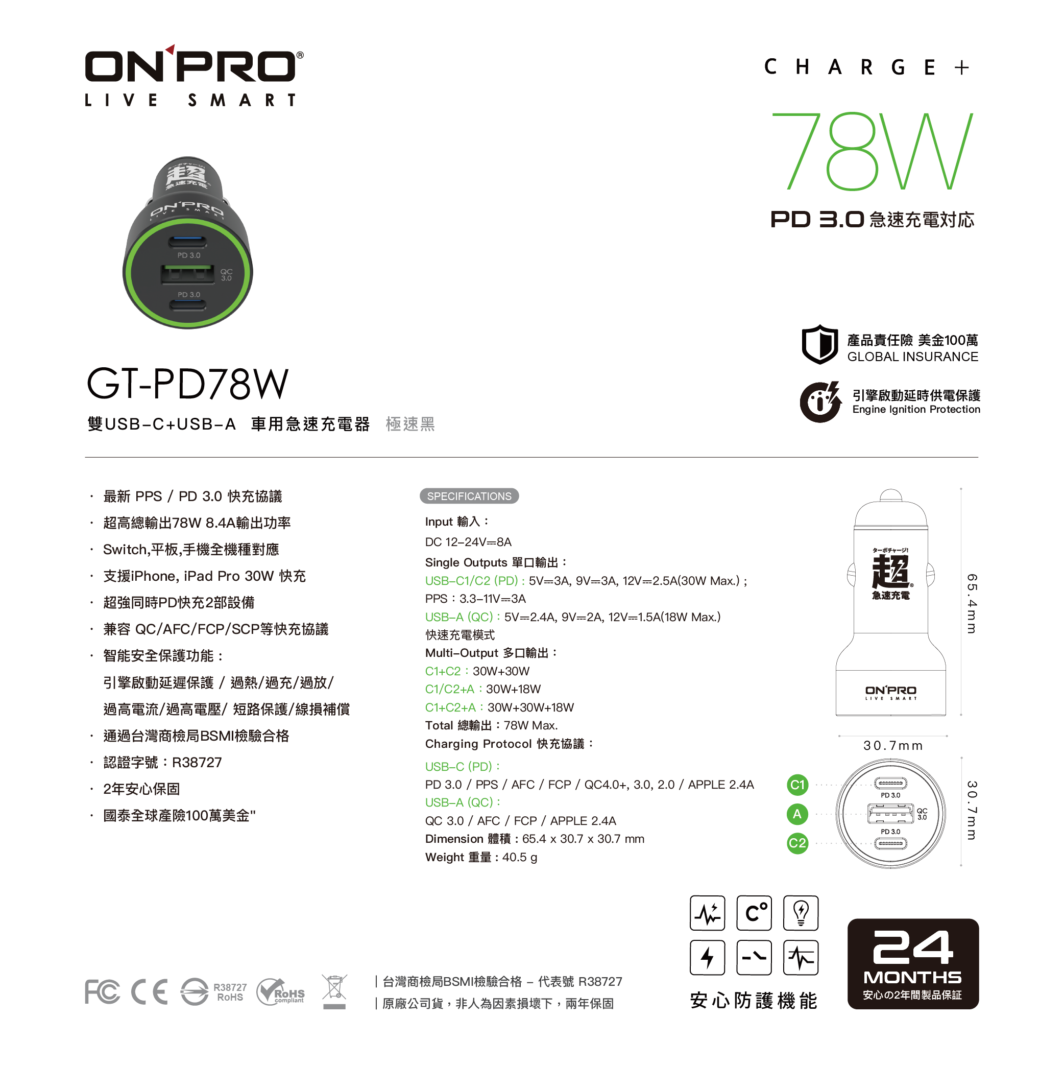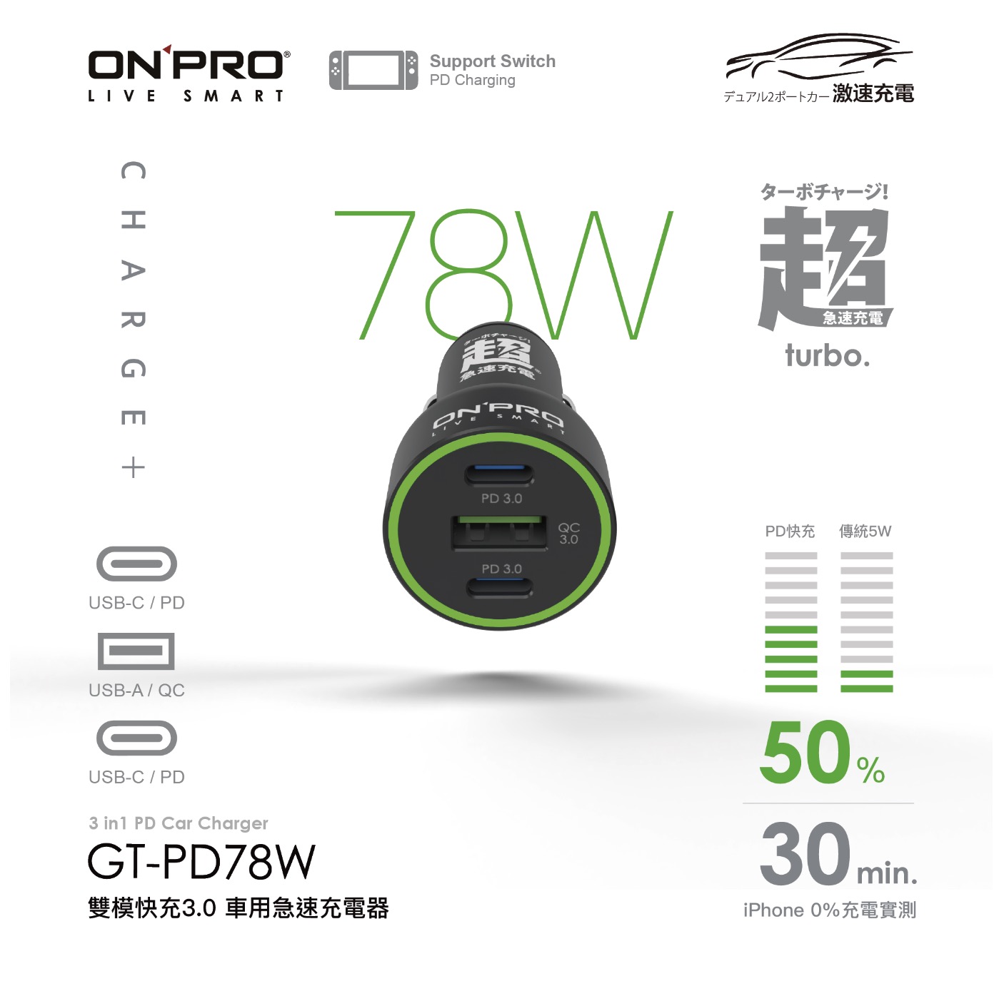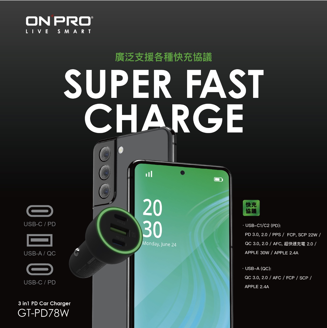 ONPRO 雙模式快充PD+QC3.0 78W 急速車用充電器