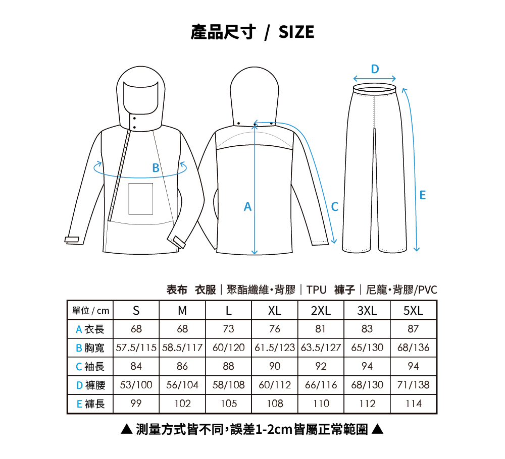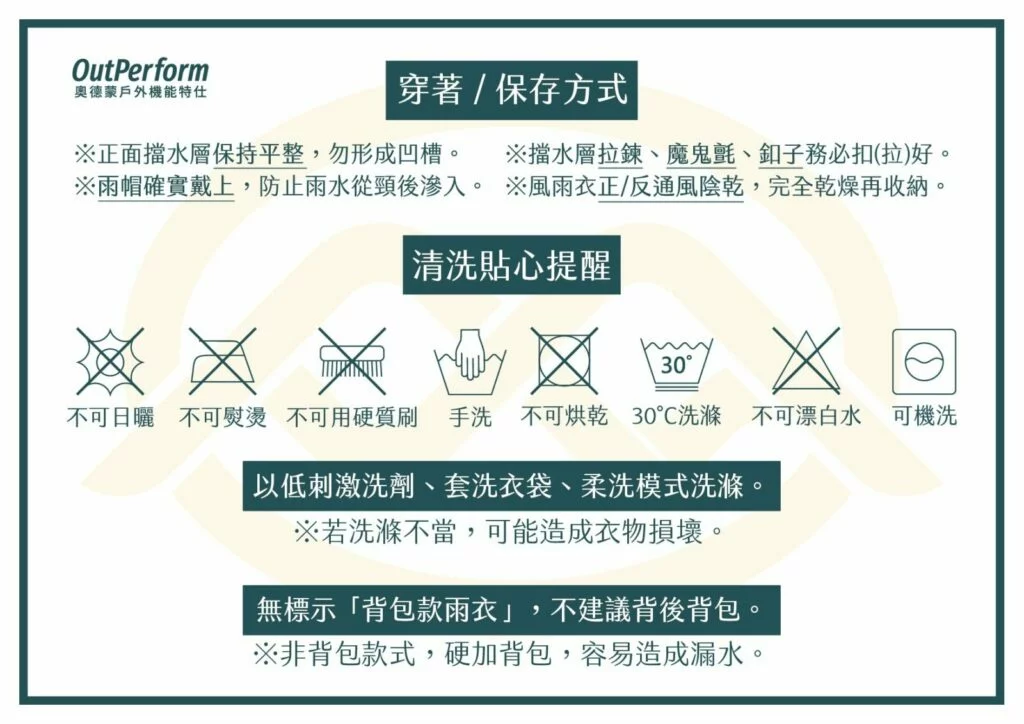 • 上衣|耐水壓 10000 mmH2O 透氣值 500 g/m²·24hrs