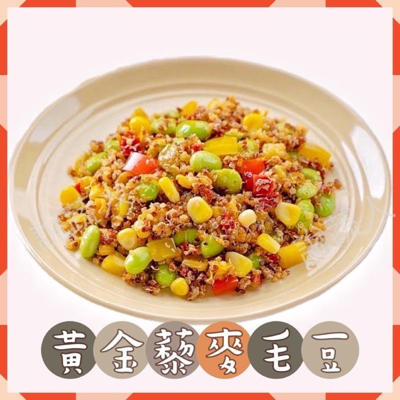 •藜麥搭配高營養鷹嘴豆、毛豆、甜玉米粒,佐紅椒、黃椒丁及高品質初榨橄欖油與些許黑胡椒