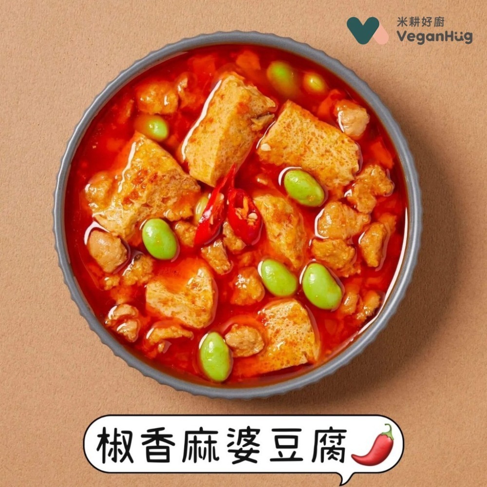 【產品成分】水、蔬菜豆腐(水、非基因改造大豆蛋白、大豆油、紅蘿蔔、豌豆仁、玉米、鹽、胡椒、酵素製劑(麥芽糊精、谷氨醯胺轉氨酶))、非基因改造大豆蛋粒、毛豆仁、大豆油、辣豆瓣(辣椒醬、非基因改造黃豆、鹽)、醬油、堂、薑、香菇、馬鈴薯澱粉、大紅袍花椒粉、辣椒粉、花椒香料(花椒萃取物)、芥花油、酵母消化蛋白質(酵母抽取物、糊精)