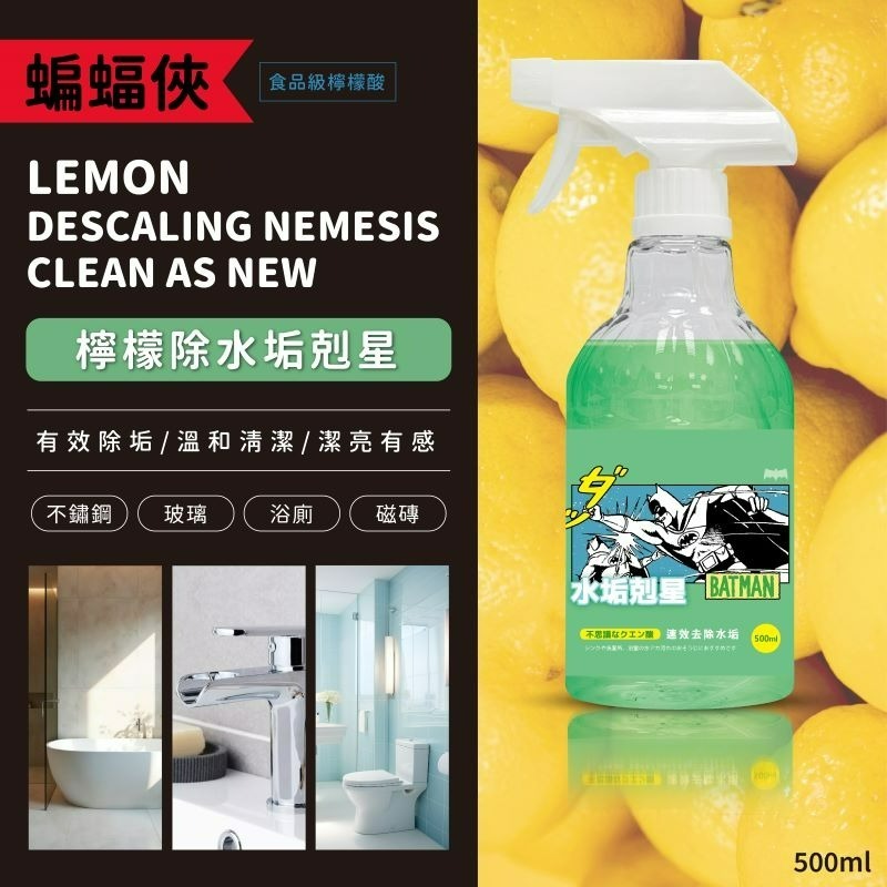 別怕,有蝙蝠俠聯名的天然檸檬清潔劑,發揮酸性剋垢力,溫和卻強效,還你潔白亮眼的衛浴空間!