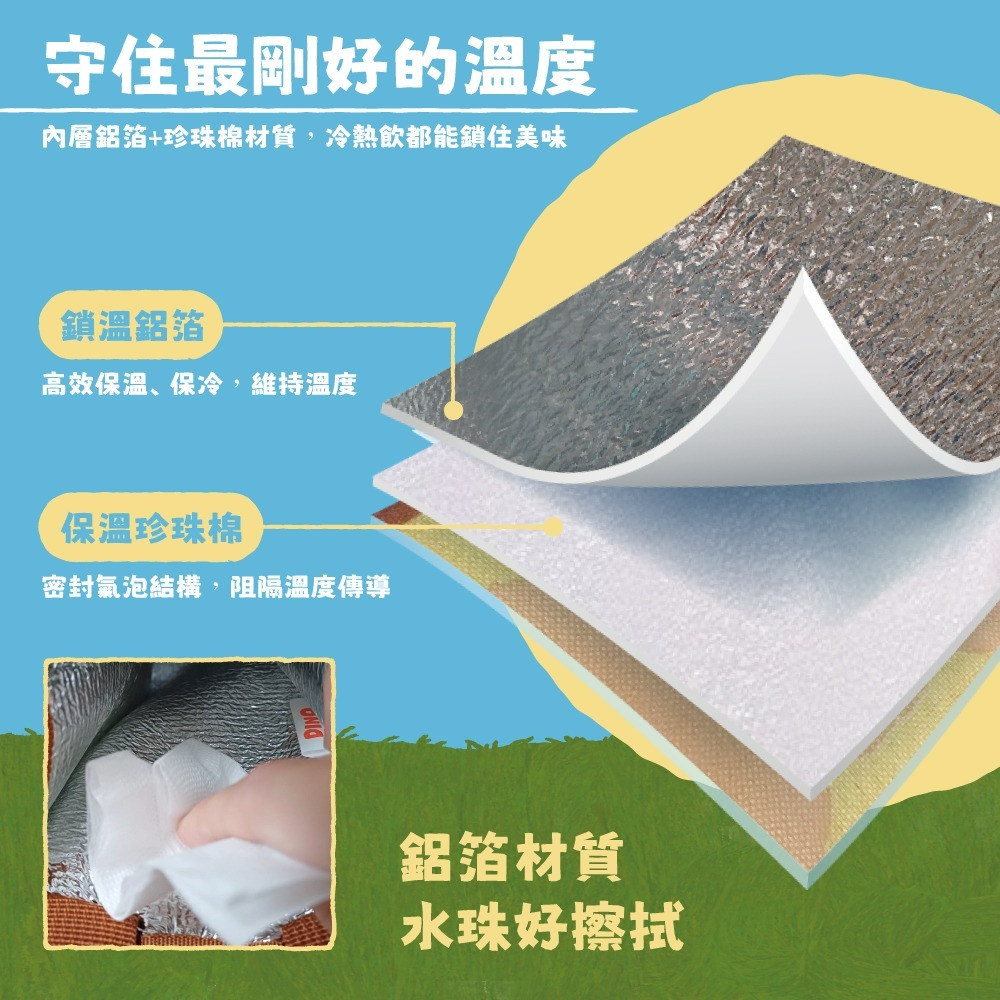內部鋁箔珍珠夾層+聚脂纖維外層,冷熱保溫佳