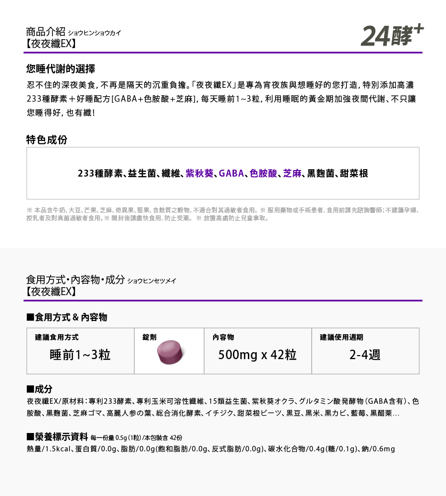 品名:24酵|夜夜纖EX/內容量:42粒/入。