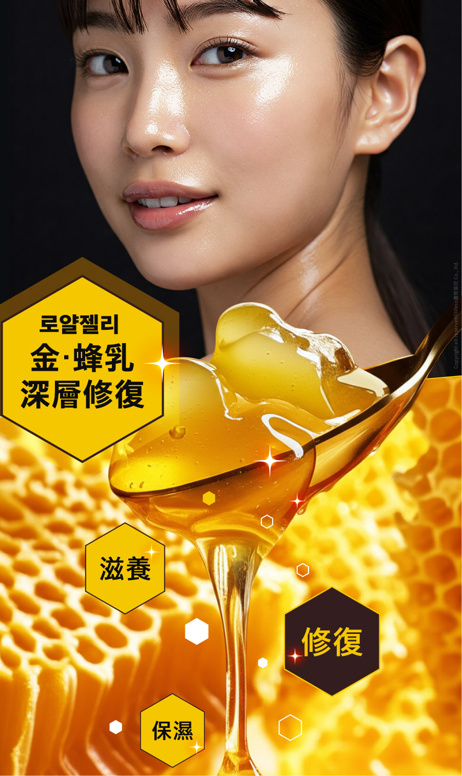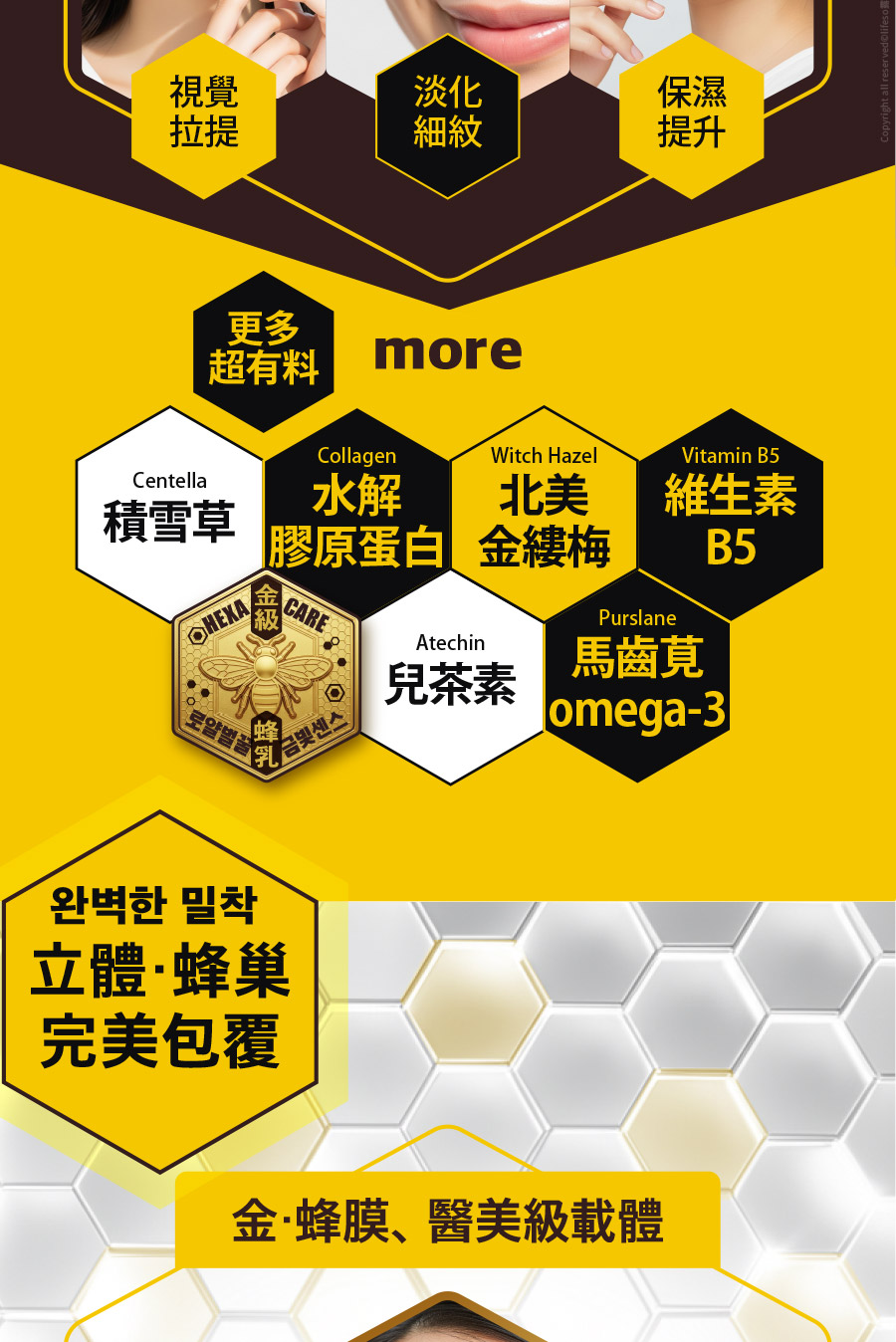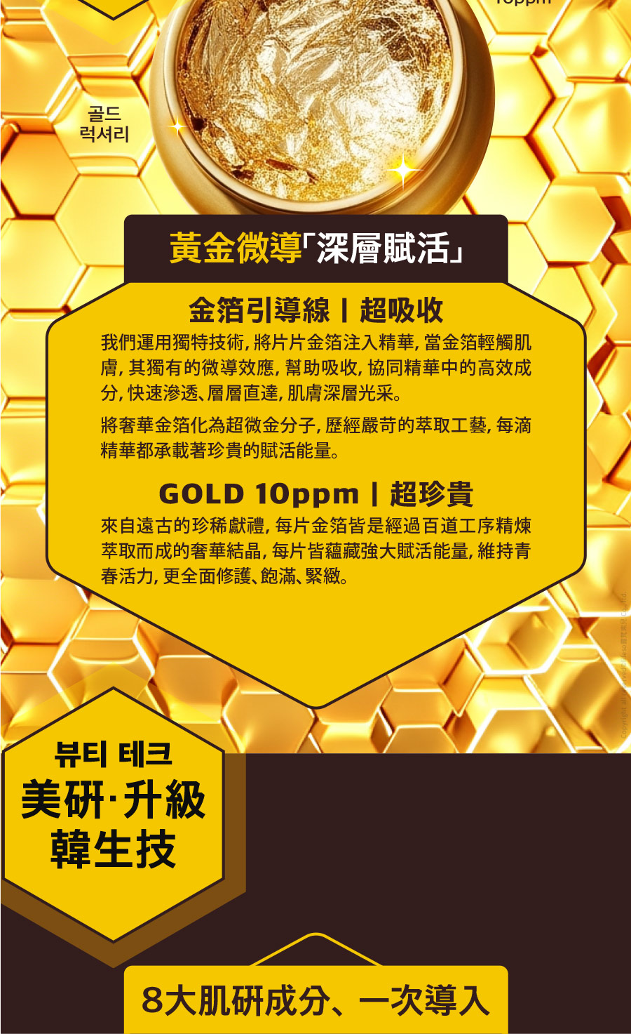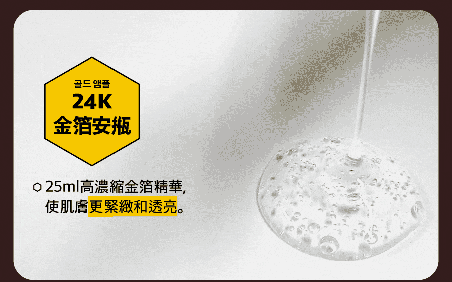 主要成分:金蜂王乳、金箔、玻尿酸納、六胜肽、β-葡聚醣、水解膠原蛋白、積雪草萃取、北美金縷梅水、維生素B5、兒茶素、馬齒莧萃取...等。/保存期限:三年。/原產地:韓國。/用途:撫平細紋、延緩肌膚老化,加強保濕、回彈、舒緩賦活肌膚。/保存條件:請放置陰涼乾燥處,並避免高溫及陽光直射,開封後盡快使用完畢。