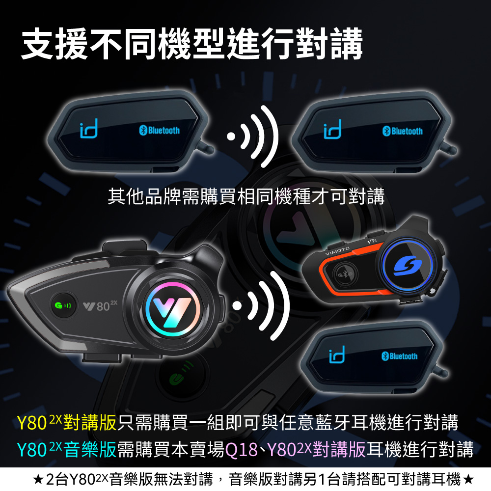 一台Y802X與一台它牌耳機:需透過Y802X開關機來重新連接對講。如果對方耳機是TWS耳機,需先關閉一隻耳機的藍牙才能配對對講。