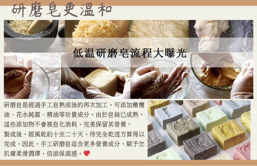 「純手工製作,讓您的肌膚享受天然的呵護。」