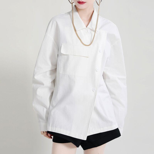 【韓國東大門】 2021秋季新款暗黑風設計感翻領斜排扣不規則門襟長袖襯衫