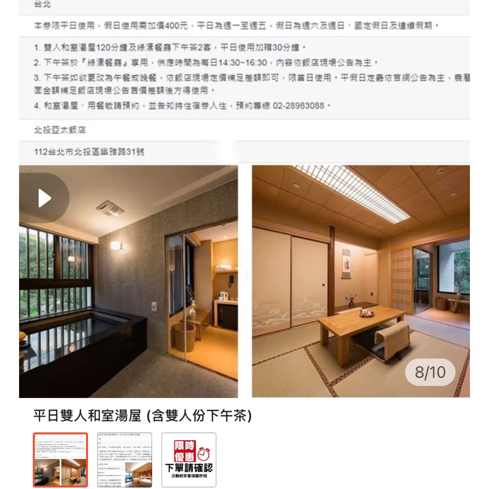 品名 : 北投亞太飯店 平日雙人和室湯屋 (含雙人份下午茶)