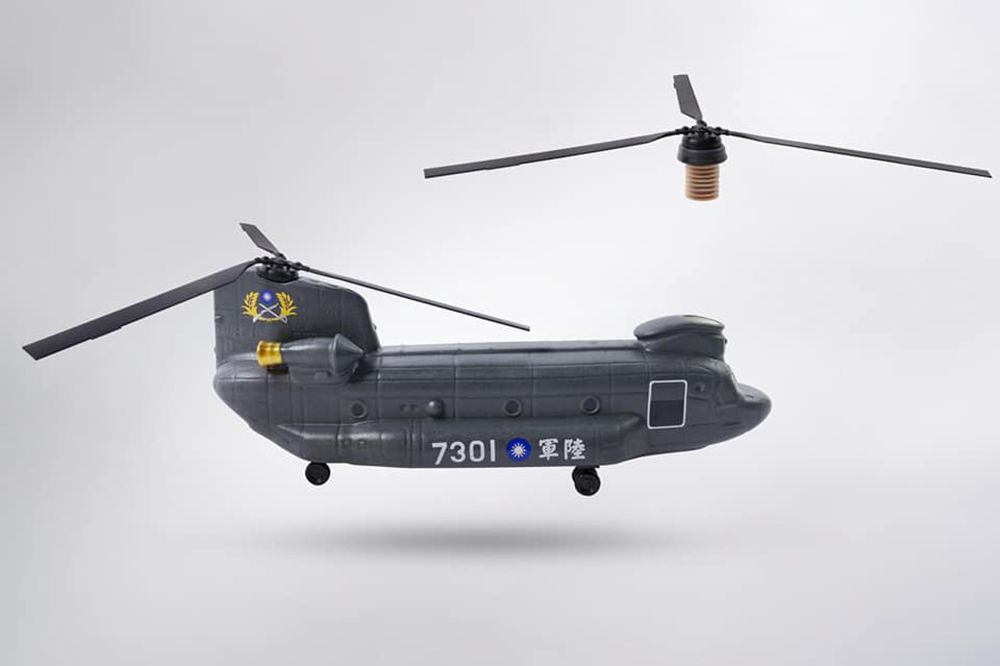 我們將CH-47SD運輸型直昇機作為酒器的外型設計,以瓷器燒製工藝,構想瓶身仿真直升機模型樣式,擁有動力雙引擎、起落架、縱列式雙旋翼造型,瓶頭設計於前旋翼,螺旋槳可動態旋轉,製作過程至少8道工序,表面陶瓷燒製如同金屬外殼材質,並刻畫了複雜的機身零件細微,霧面的上釉技術突破了傳統的釉彩加工思維。