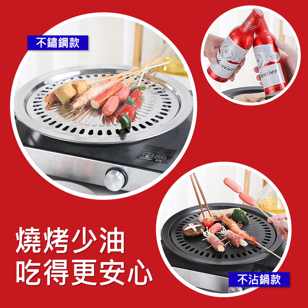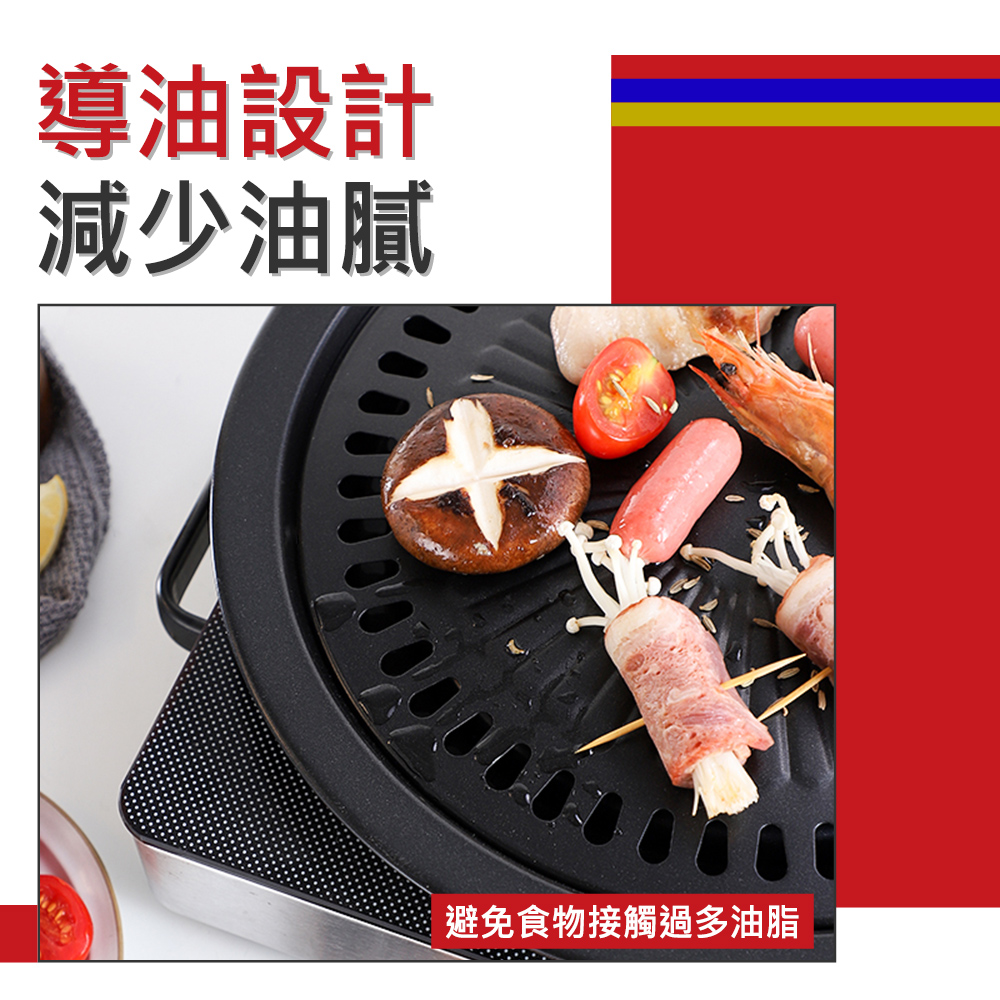 韓式圓形烤盤,一體壓鑄,盤面凹凸線設計,讓食物能夠不沾黏的受熱,同時也能讓多餘的油脂流出,整體自帶些微傾斜,油脂可直接從兩旁往下流。烤盤全身可水洗,簡單沖刷即可清潔乾淨。烤肉用韓式不沾鍋圓型烤盤,輕鬆使用不必一直換網,也能吃的不油膩更健康。