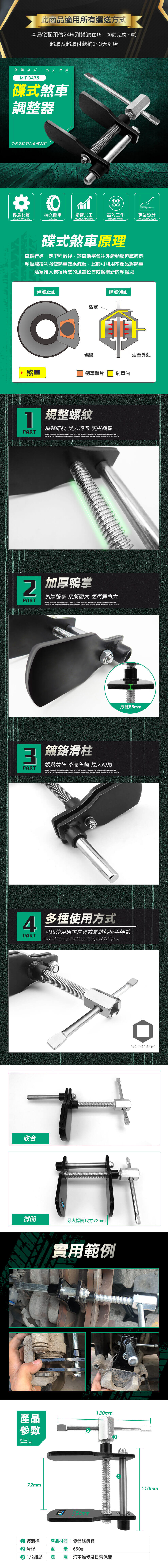車輛行進一定里程數後,煞車活塞會往外鬆動壓迫摩擦塊,摩擦塊損耗將使煞車效果減低,此時可利用本產品將煞車,活塞推入恢復所需的適當位置或換裝新的摩擦塊,讓車子的剎車系統能夠恢復正常作業。