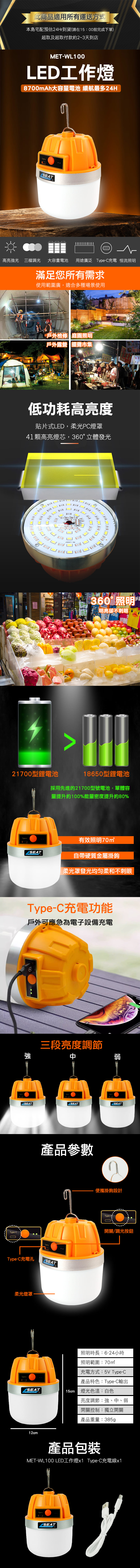 產品名稱:MET-WL100_LED工作燈(21700鋰電池)