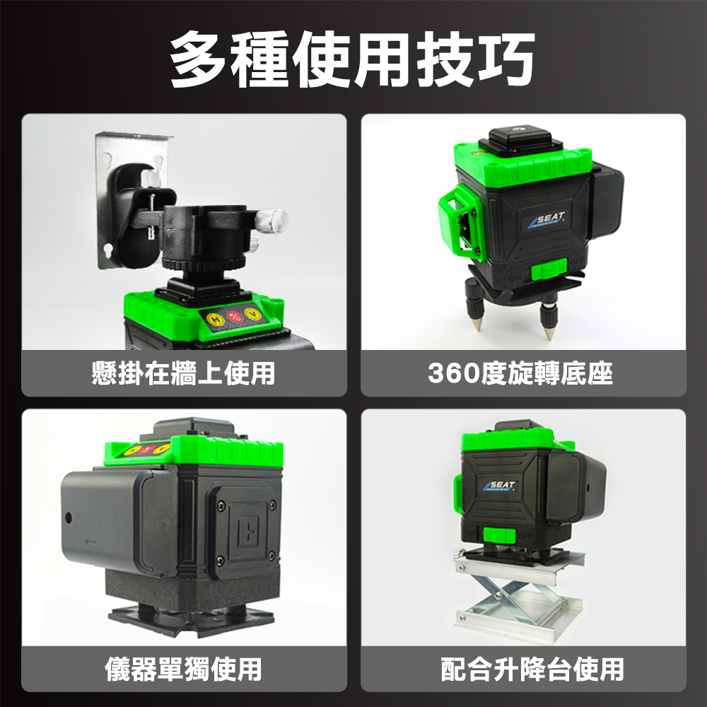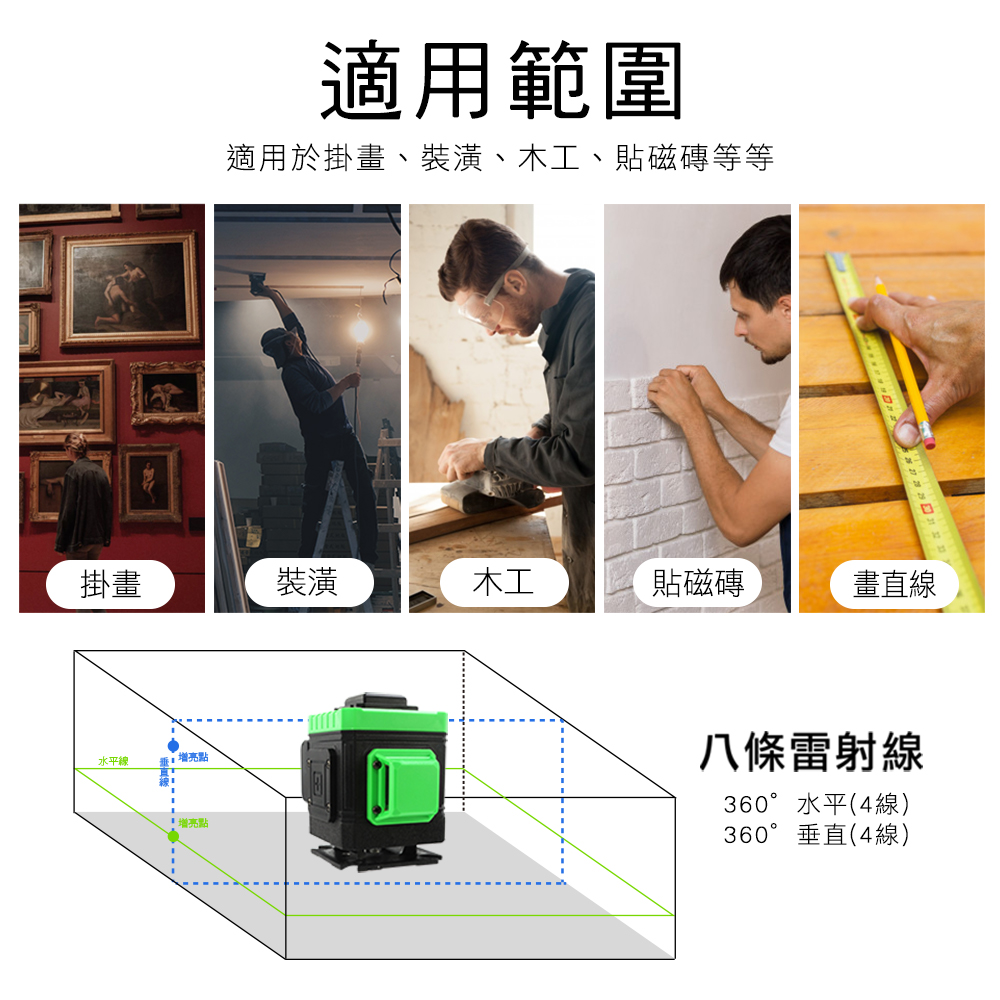 -八線雷射線,360°水平線(4線) /360°垂直線(4線)。