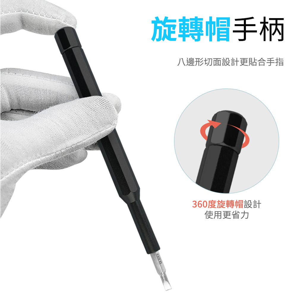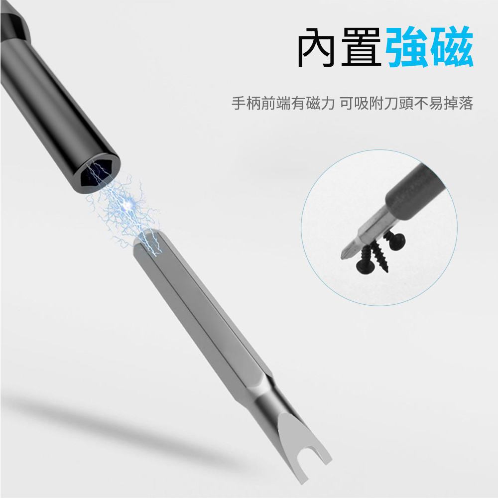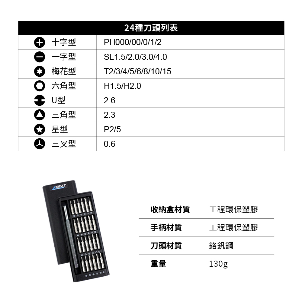 總共有24個螺絲起子頭加一支螺絲起子手柄,符合各種產品螺絲需求。手把前端具有磁力,可吸附住刀頭,使其不易掉落。刀頭採用鉻釩鋼製造,性能出眾,外殼全部採用工程環保塑膠,防摔性能強,外型輕薄好攜帶。
