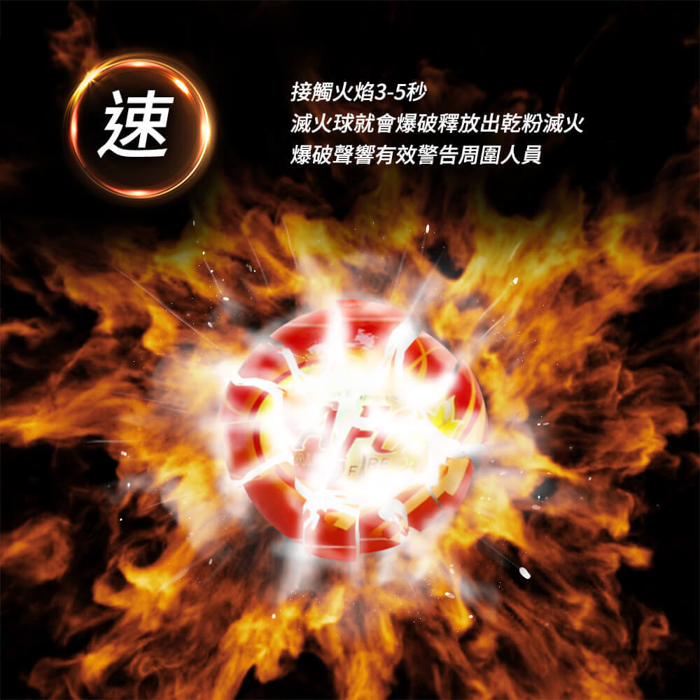 滅火球是一種新型消防器材,遇火會炸裂釋放內部的乾粉滅火,適用於撲滅初期火災。其爆破聲響能作為有效的火災警報,警告周遭人員。使用方式有兩種,可以平時在容易起火點(插座、電源、廚房等)約離30公分處,利用內附螺絲安裝支架,將球放置支架上備用,起火當下立即發揮作用;也能在火災發生時,從遠處往起火點投擲,不必靠近火場就能安全滅火。
