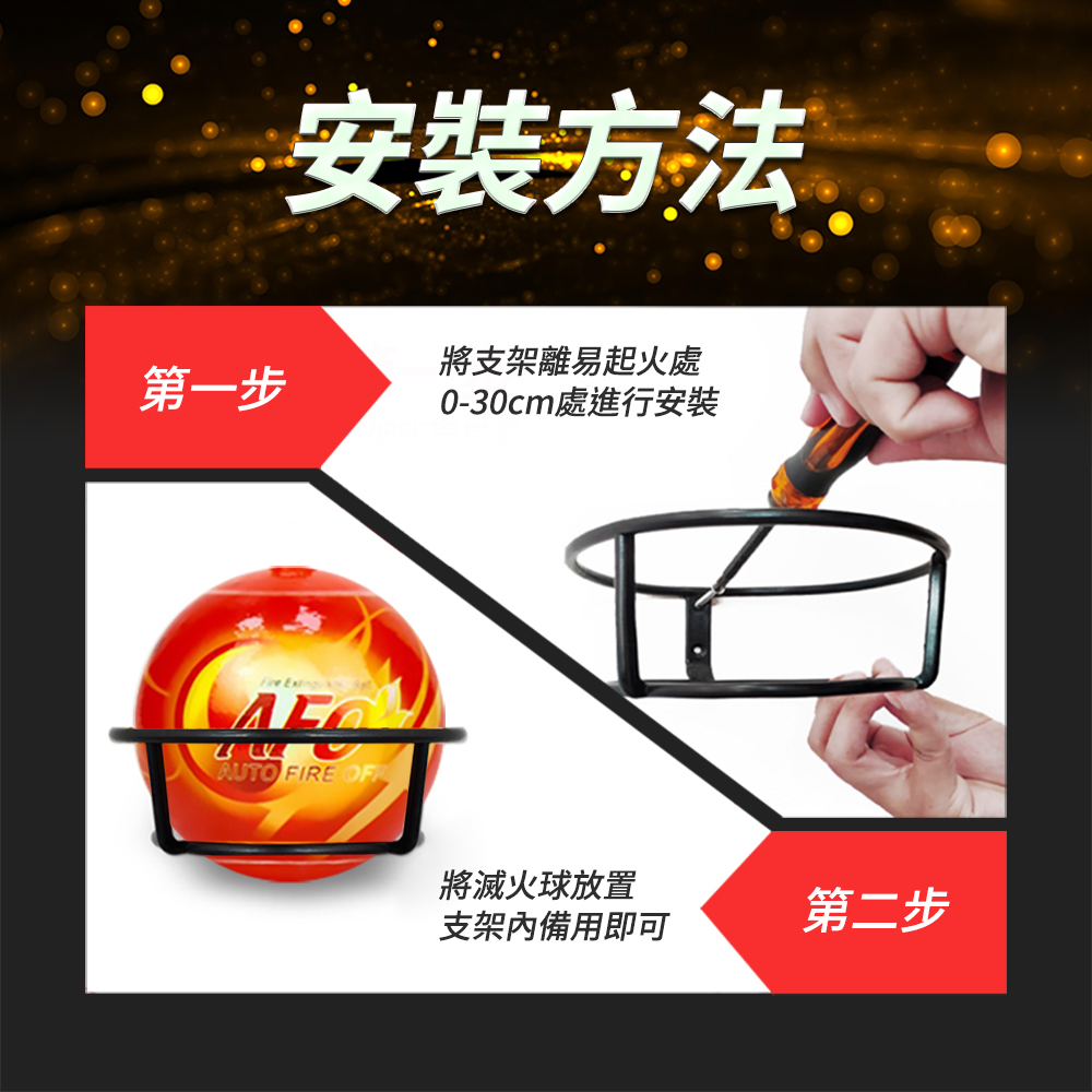 使用方法:安裝支架放置在易起火處/火災發生時投擲進入火場