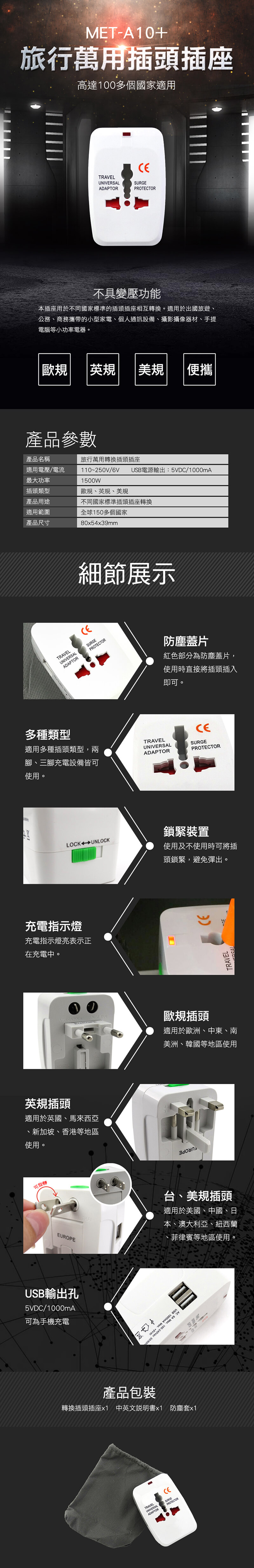 產品名稱:MET-A10+_旅行萬用轉換插頭插座+雙孔USB