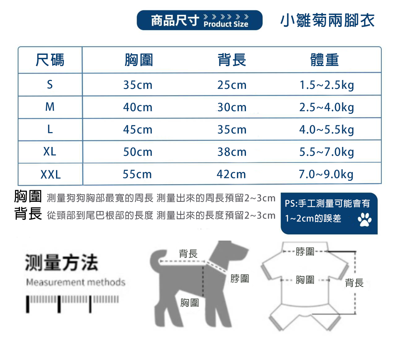 【尺寸】請參考尺寸圖(體重為參考,請以胸圍及背長為準)