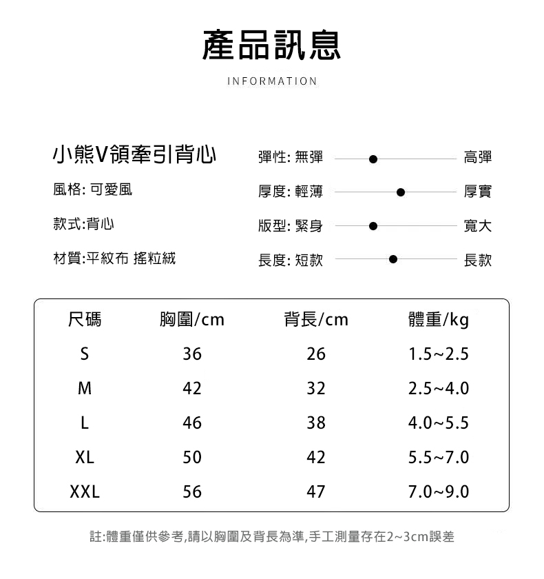 ex:【模特A】胸圍34cm 背長26cm 體重2kg,穿S碼