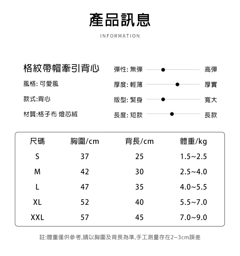 【尺寸】請參考尺寸圖(體重為參考,請以胸圍及背長為準)