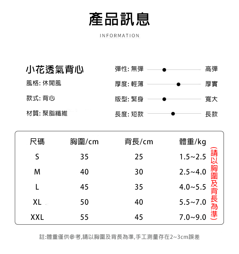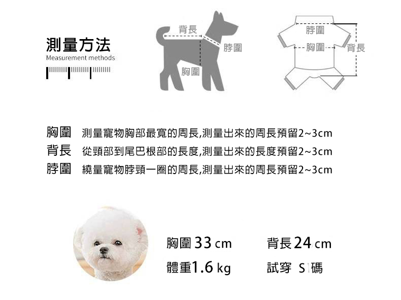 【尺寸】請參考尺寸圖(體重為參考,請以胸圍及背長為準)