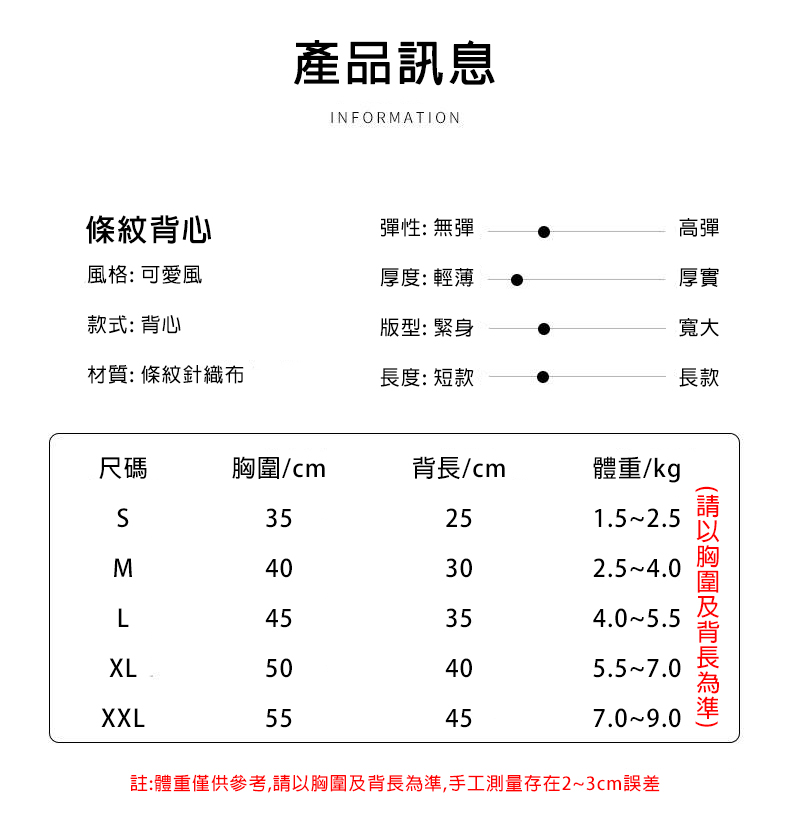 【尺寸】請參考尺寸圖(體重為參考,請以胸圍及背長為準)