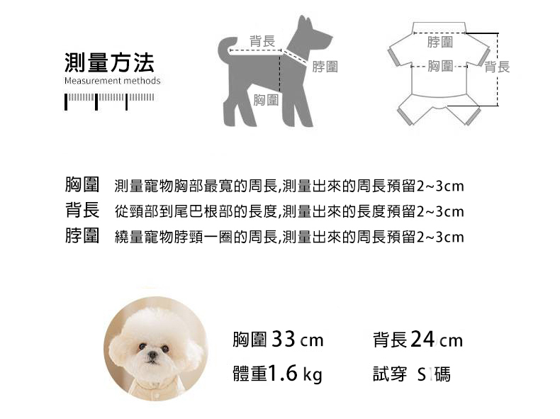 ex:【模特A】胸圍33cm 背長24cm 體重1.6kg,穿S碼